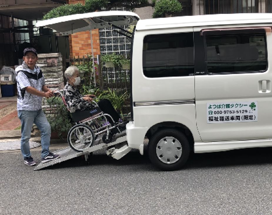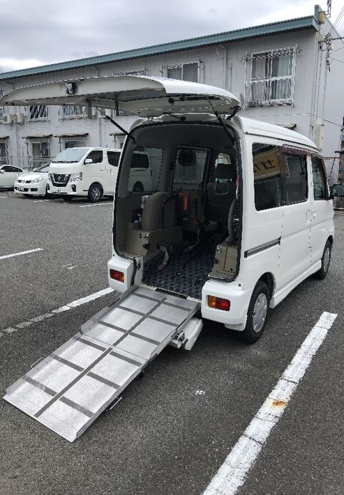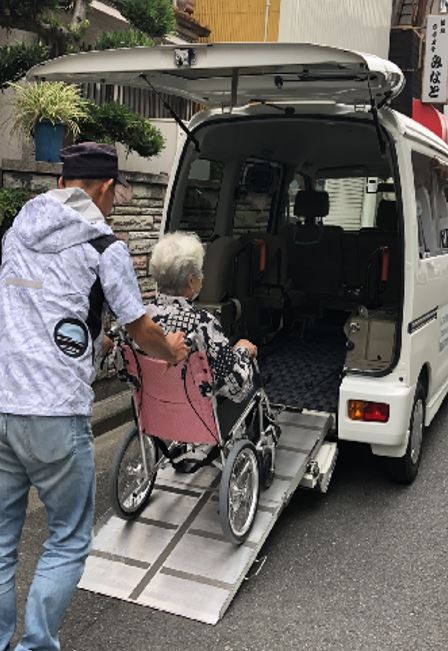 ○車いすに乗ったまま乗り降り可能です。(スロ-プ付き車両の為、乗車がスム-ズです)